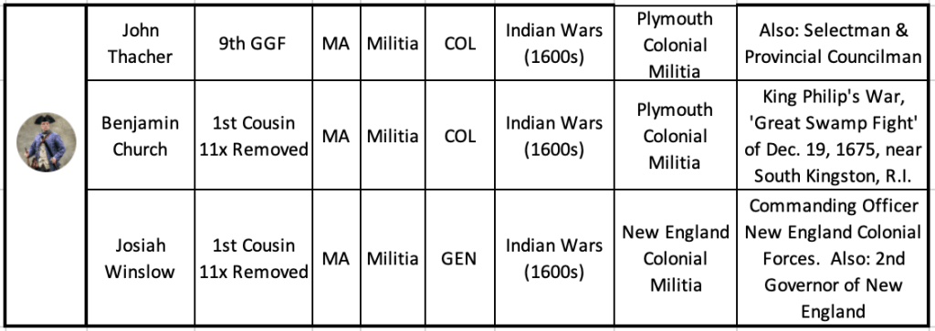 Oldest Historical Veterans: The earliest veterans in my family tree include my 9th great-grandfather, John Thacher (c.1638–1713), and two cousins, Benjamin Church (c.1640–1717) and Josiah Winslow (1628–1680). Likely serving by 1665, John Thacher reached Major by 1694 and later retired as a Colonel. He wrote to the Lieutenant Governor about challenges recruiting volunteers for conflicts with Native American tribes.