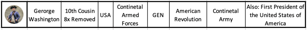 The Most Famous Veteran and Highest Ranking: Without a doubt, the most renowned veteran in my family tree is my 10th cousin, 7 times removed—General George Washington. Some might say, “Aha! An insurrectionist and slaveholder!” However, as I mentioned earlier, certain leadership qualities can spark a shift in thinking, and General Washington displayed some of these through his words and actions.