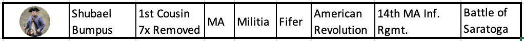 Youngest Veteran and Likely the Lowest Ranking: At just 17, Shubael Bumpus signed up for a three-year term in the Massachusetts colonial militia as a fifer in Colonel Gamaliel Bradford’s Regiment and Colonel Joshua Eddy’s Middleborough Men. He joined reinforcements around Fort Ticonderoga in June 1777 and participated in the Battle of Saratoga that same year.