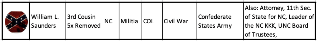 Many leaders, both past and present, come to mind as fitting this description—individuals who had the chance to do what was right but chose otherwise. In my family, my choice for the most infamous veteran is Col. William L. Saunders (1835–1891). Saunders served as a Colonel in the Confederate States Army (CSA) and was an educated attorney. Following the Civil War, he became the Secretary of State of North Carolina and led the Ku Klux Klan (KKK) in that state. His influence and actions, both during and after the war, are clear to me, even if they aren’t to others.