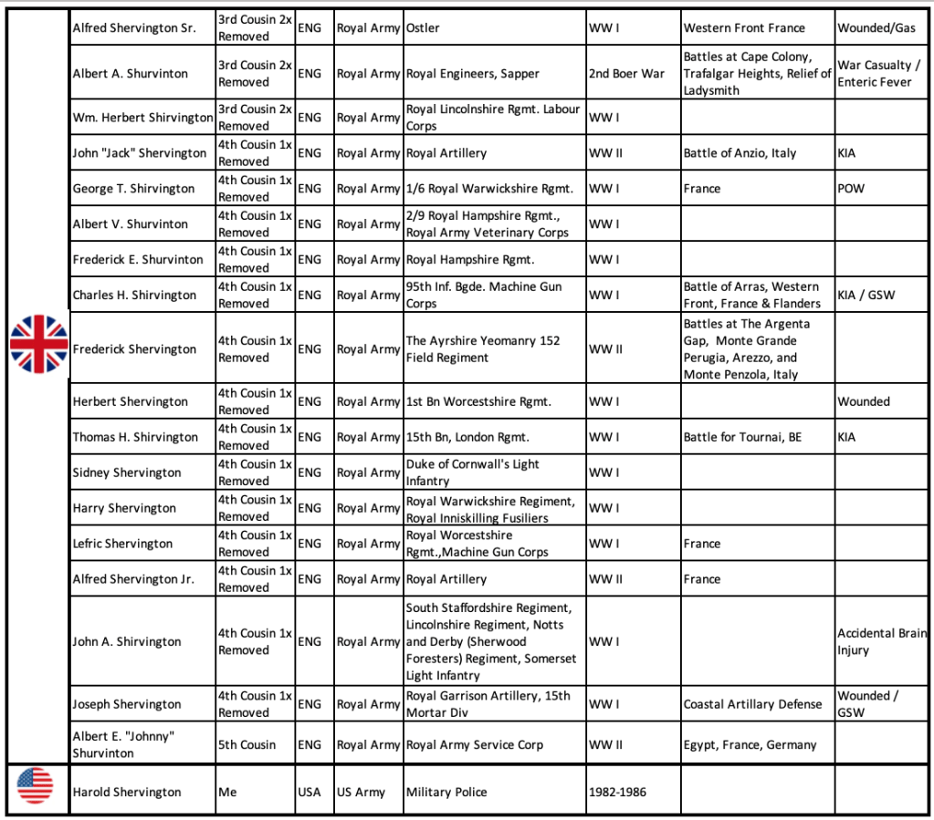 SHERVINGTON Veterans: *Special thanks to my 5th cousin Colin from across the pond for some last minute additions. Colin and I are related through my 4th great-grandfather Job Shervington (b.1758-d.1835).