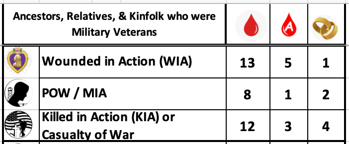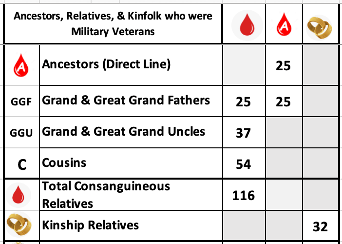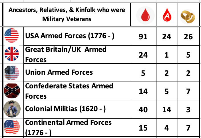 Over the years, I’ve found many veterans in my family tree, and my research recently took an exciting turn. A close DNA match helped solve the mystery of my grandmother’s 1922 adoption, revealing her maternal biological identity and leading to the discovery of even more veterans in my lineage. My research is ongoing, but so far, I’ve identified 25 ancestors, 91 uncles and cousins, and 32 kin who served.