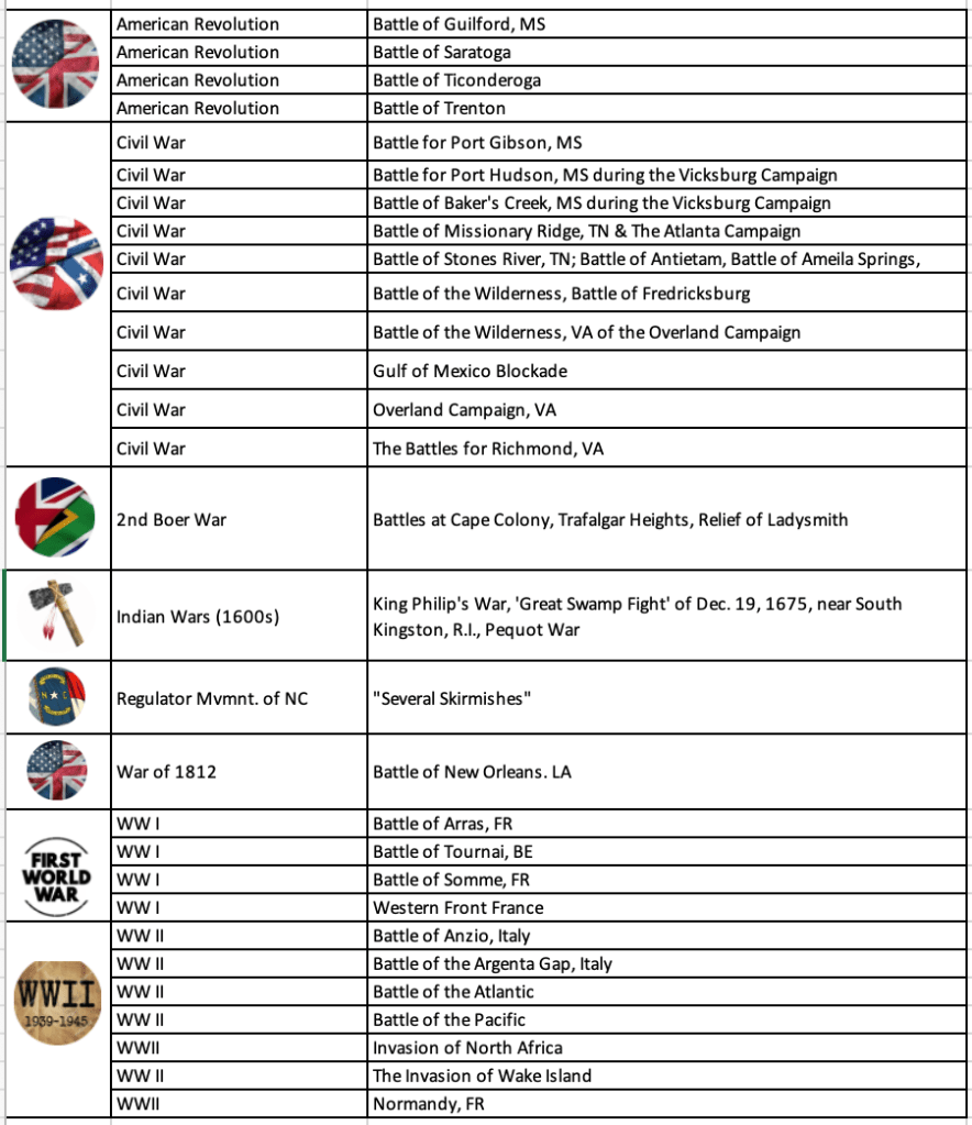 Some served in conflicts, while others did not. Still, many have records detailing their involvement in battles spanning pre-revolutionary conflicts through the Vietnam War across North America, Europe, Africa, the Arabian Peninsula, and India.