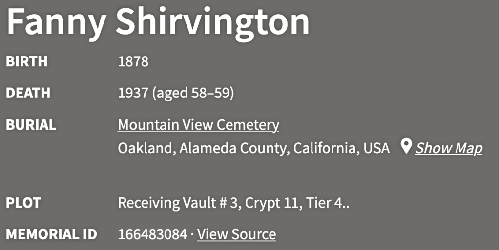 I also came across a burial listing for a Fanny Shirvington (1878–1937) at Mountain View Cemetery in Oakland. Since it was in the Bay Area, I assumed she belonged to the same California branch—“just another unrelated Shirvington,” I figured—and set it aside.