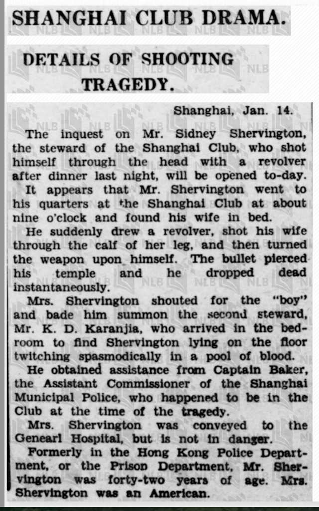 According to official accounts, Sidney returned to their apartment in the Shanghai Club after dinner and, while Fanny lay in bed, shot her in the leg—then turned the gun on himself. Fanny, wounded, screamed for help. A steward and an assistant police commissioner who happened to be dining in the club rushed in. They found Sidney still alive, twitching, and moments later, dead.