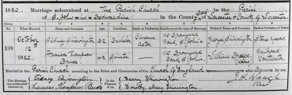 Fanny all but disappeared from the records for nearly 20 years following the collapse of her marriage. No censuses, directories, or passenger records list her whereabouts during that time—until she reemerged in Worcestershire, England in 1920, marrying Sidney Shirvington, my fourth cousin once removed.