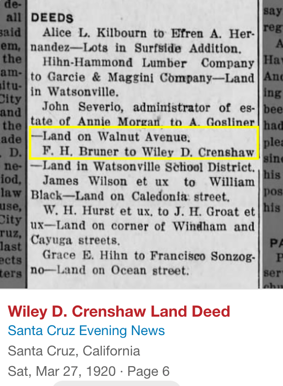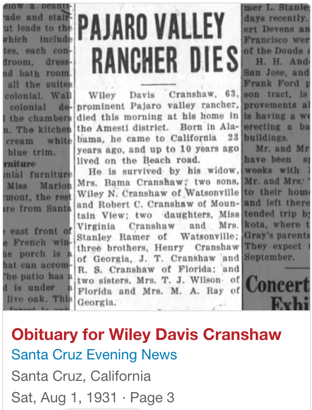 The eldest of their children, Wiley Nixon Crenshaw , married Sylvia May Cunningham—a native of Salinas—in 1925. Together, they had one daughter, Ruth Virginia. Wiley went on to manage the Central Coast’s well-known Pep Creamery, a position he held for many years. He outlived all of his siblings and lived a long life, passing away in Watsonville in 1997 at the age of 92.