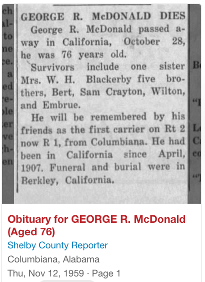 Our mother’s father was a McDonald, and this branch of the family was also rooted in Shelby County, Alabama. As I mentioned earlier, we once believed that our mother’s uncle was the only relative to venture west. But as my research unfolded, a different story began to emerge.